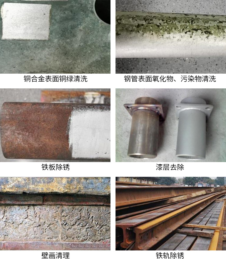 激光清洗具有無研磨、非接觸特點(diǎn),不但可以用來清洗有機(jī)的污染物,也可以用來清洗無機(jī)物,包括金屬的銹蝕、金屬微粒、灰塵等,應(yīng)用功效包括:除銹、脫漆、去油污、文物修復(fù)、除膠、去涂層、去鍍層。適用于銹層、漆層較厚,油污較深的情況下清潔,以及表面粗糙化、焊縫清潔等工藝環(huán)節(jié),效率極高。應(yīng)用行業(yè):航空、船舶、文物保護(hù)、汽車周邊、食品行業(yè)、軌道、橡膠模具、其他。